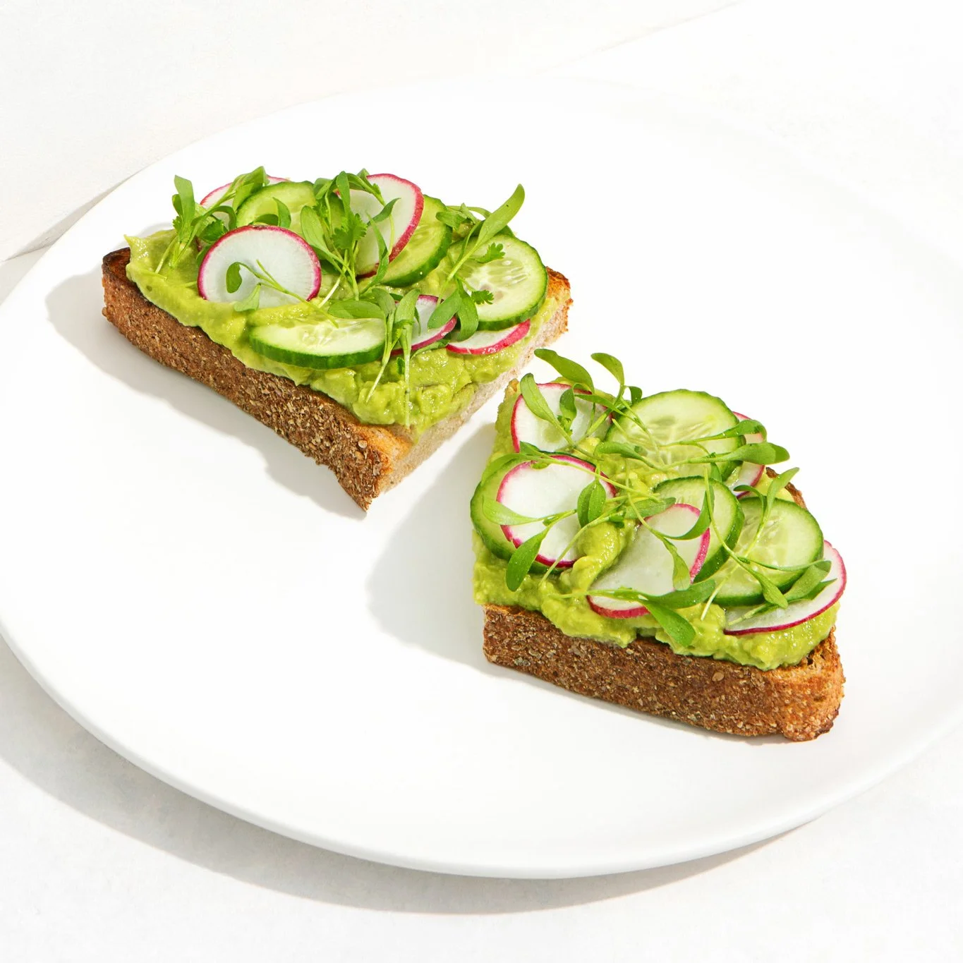 toasted sourdough topped with avocado smash, fresh lemon juice, micro cilantro, radish, cucumber, olive oil drizzle