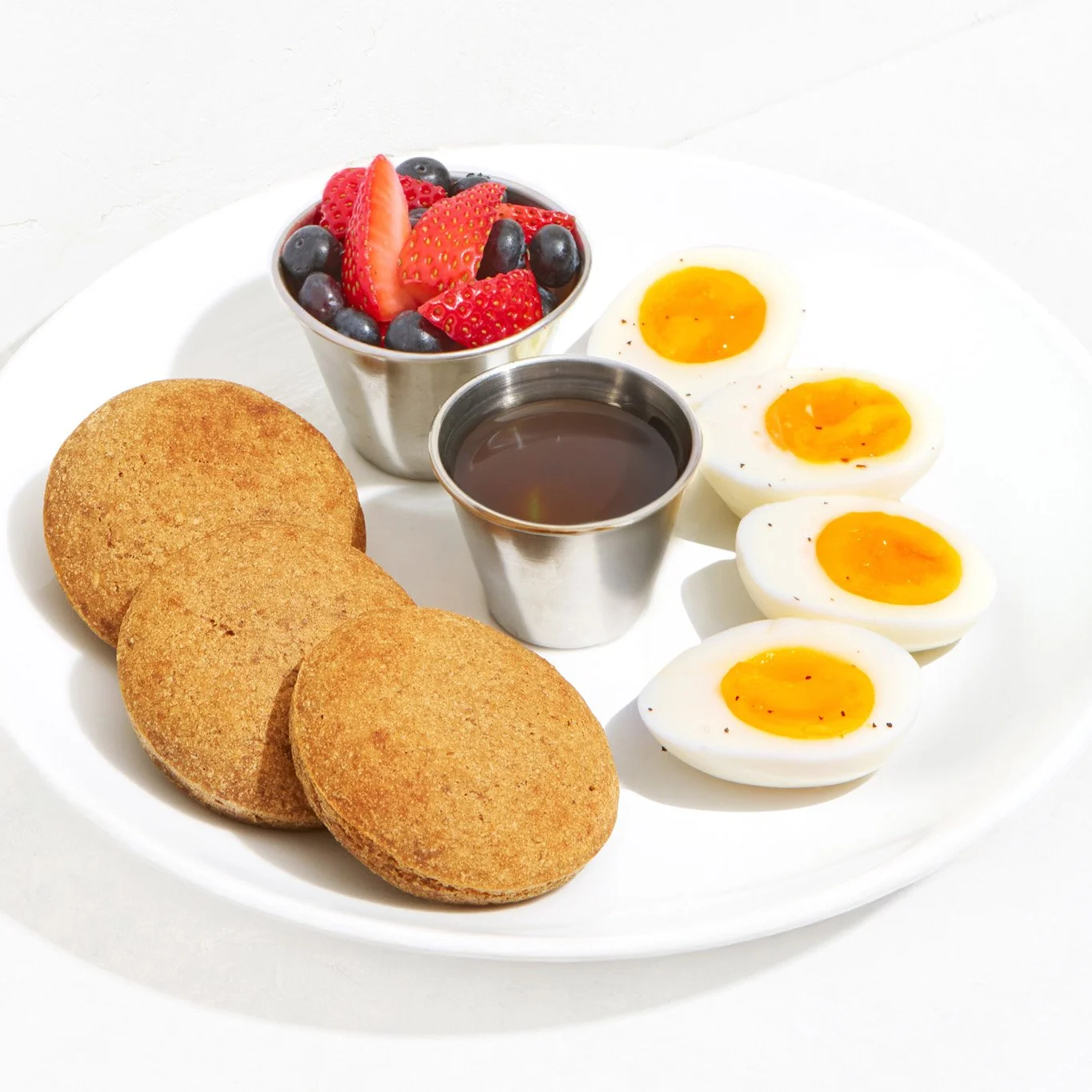 homemade pancakes made with sweet potato, banana, gf flour, side of maple syrup, fresh seasonal fruit, your choice of pasture-raised eggs
