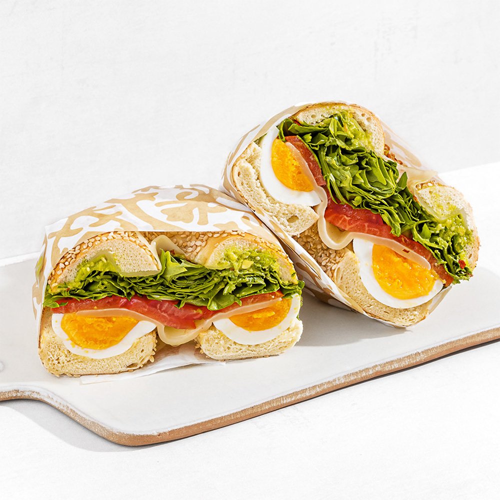artisanal toasted bagel scooped, pasture-raised eggs, mozzarella, arugula, avocado smash, tomatoes, olive oil, red pepper flakes