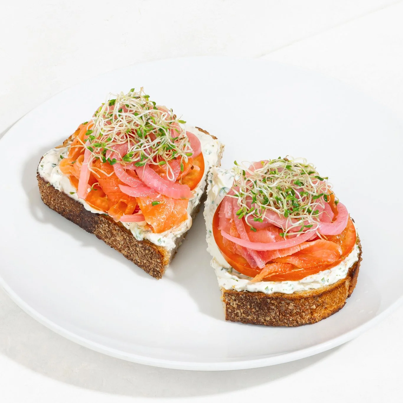 toasted sourdough, whipped scallion dill cream cheese, smoked salmon, sliced tomato, pickled red onion, alfalfa sprouts, lemon oil drizzle
