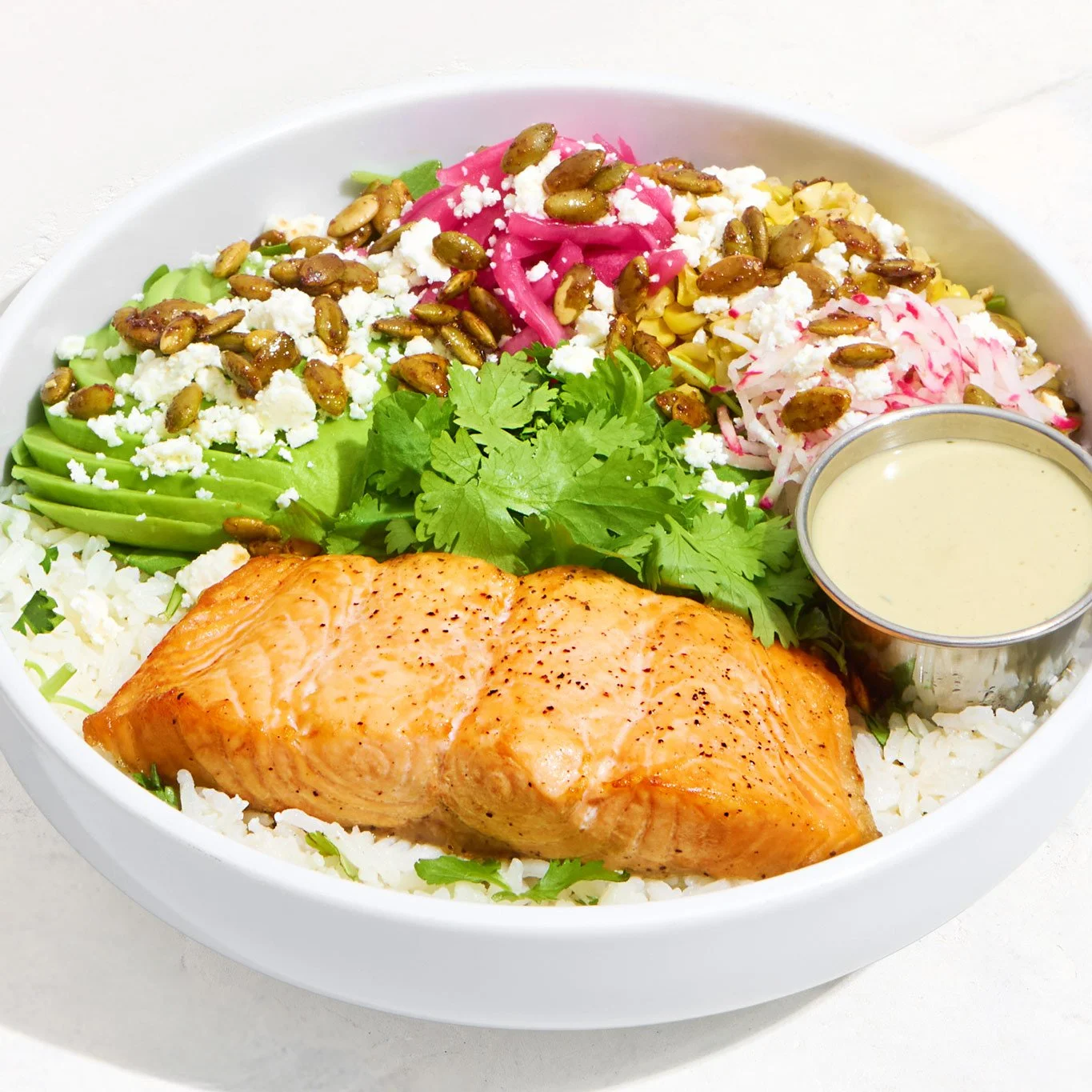 oven-roasted salmon, cilantro jasmine rice, arugula, roasted corn, avocado, pickled red onion, radish, spiced pumpkin seed, crumbled feta, cilantro, green tahini