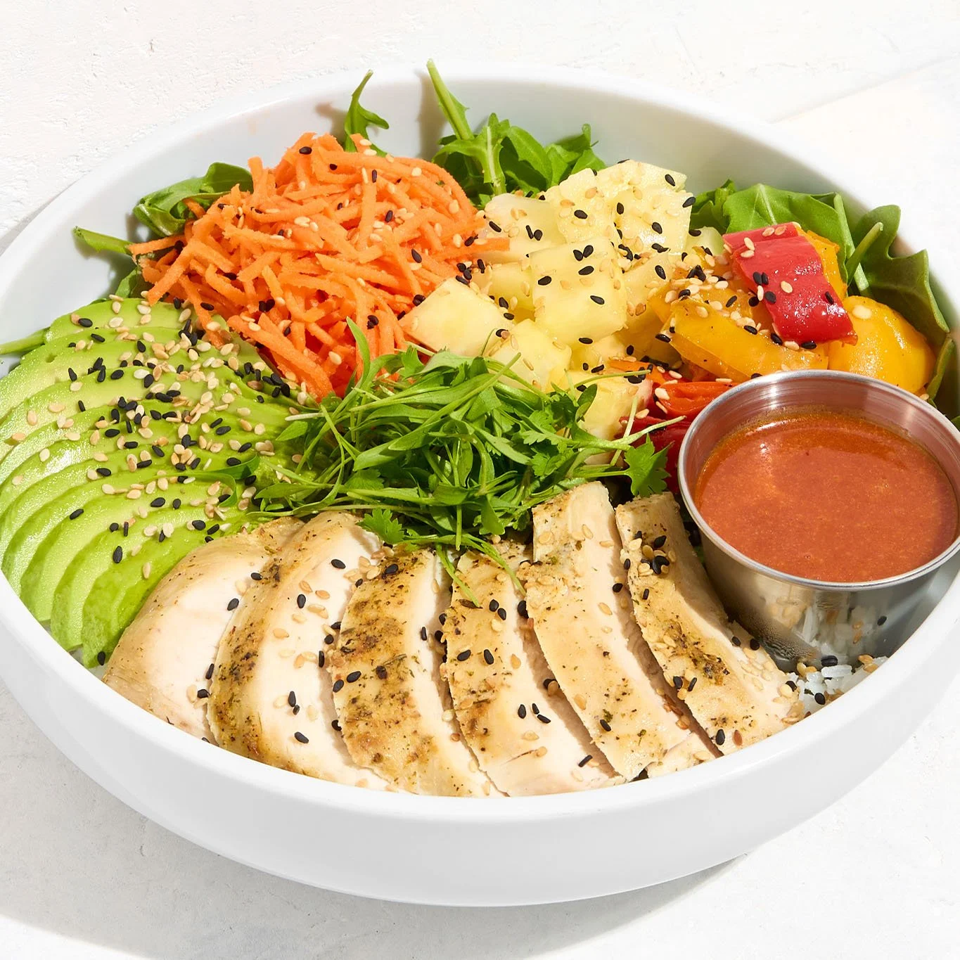 antibiotic-free chicken, cilantro jasmine rice, arugula, avocado, pineapple, carrot, sweet bell pepper, cilantro, sesame, spicy soy ginger side