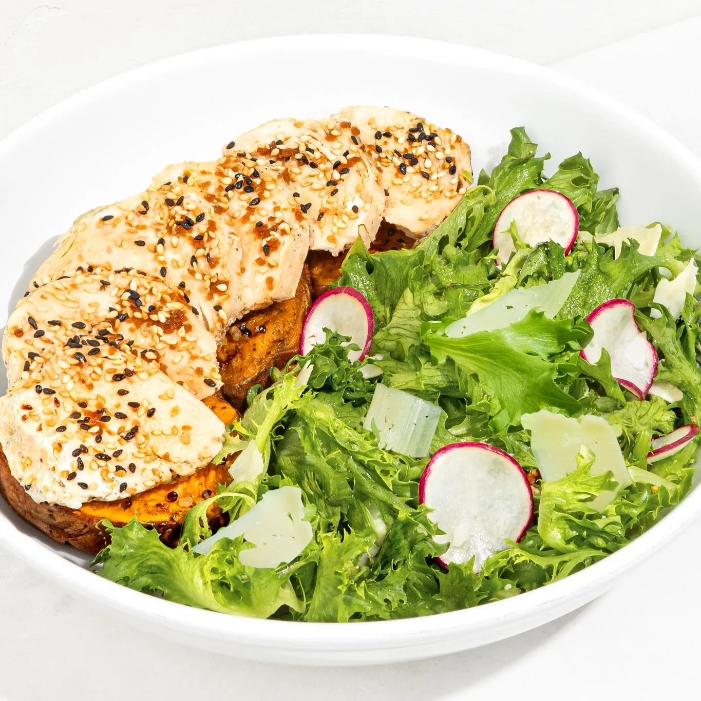 antibiotic-free chicken & choice of base, topped with sesame seed, served with ponzu yuzu sauce* & house salad made with mixed greens, green onion, radish, pecan, parmesan, sumac** vinaigrette | *contains sesame | **contains cashew