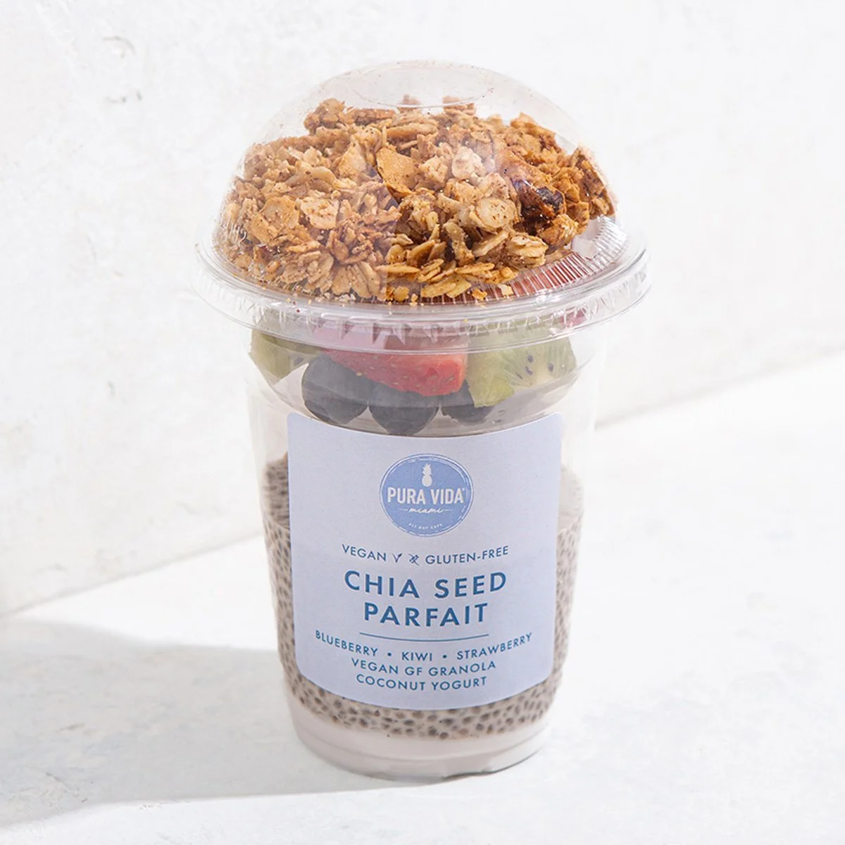 chia seed pudding made with almond mylk, maple syrup, vanilla | coconut yogurt, blueberry, strawberry, kiwi, vegan gluten-free granola* | *contains tree nuts: almond, walnut